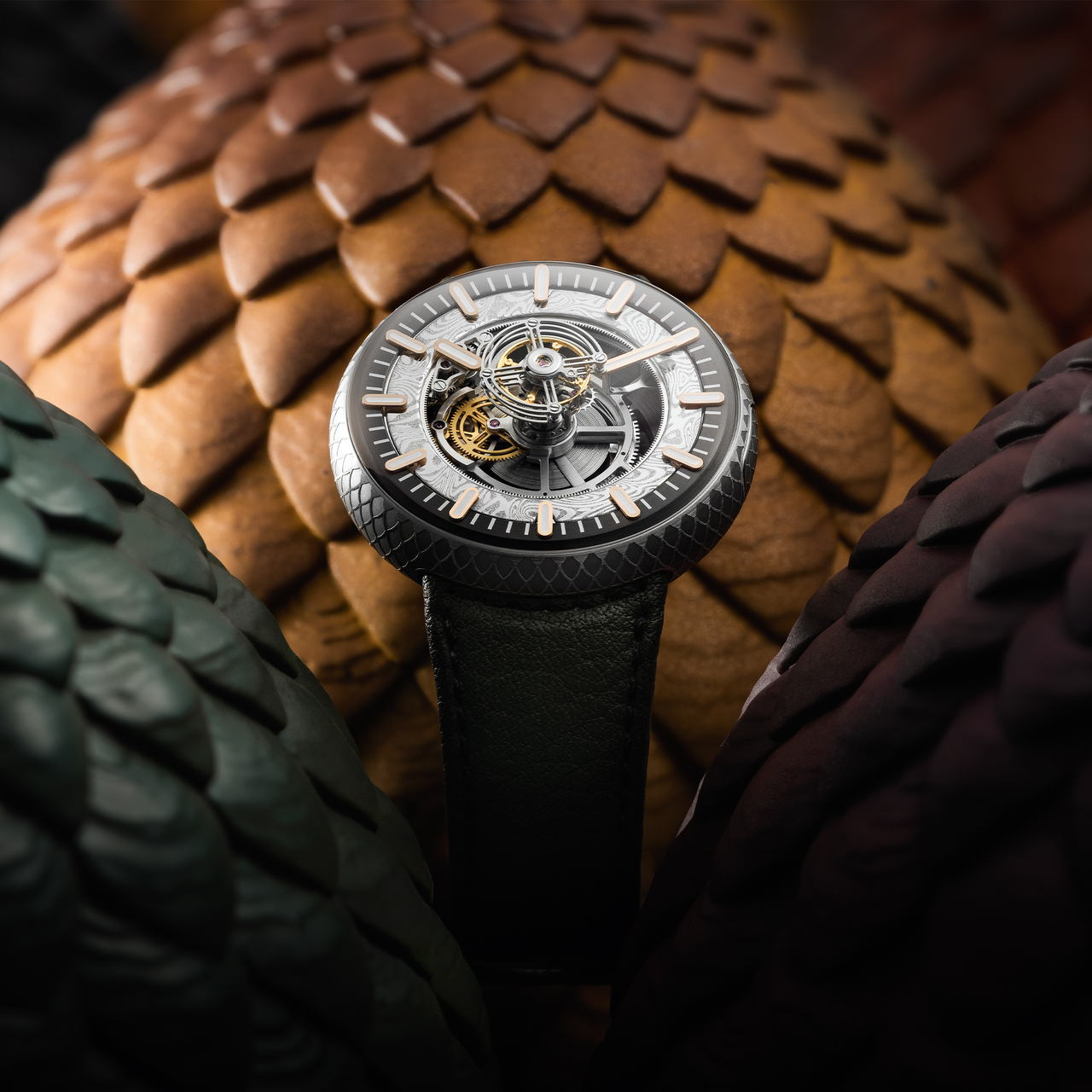This collection is a series of unique collector sets, each composed of a central floating tourbillon watch paired with a sculptural dragon egg functional art piece, creating a fully immersive and collectible experience.