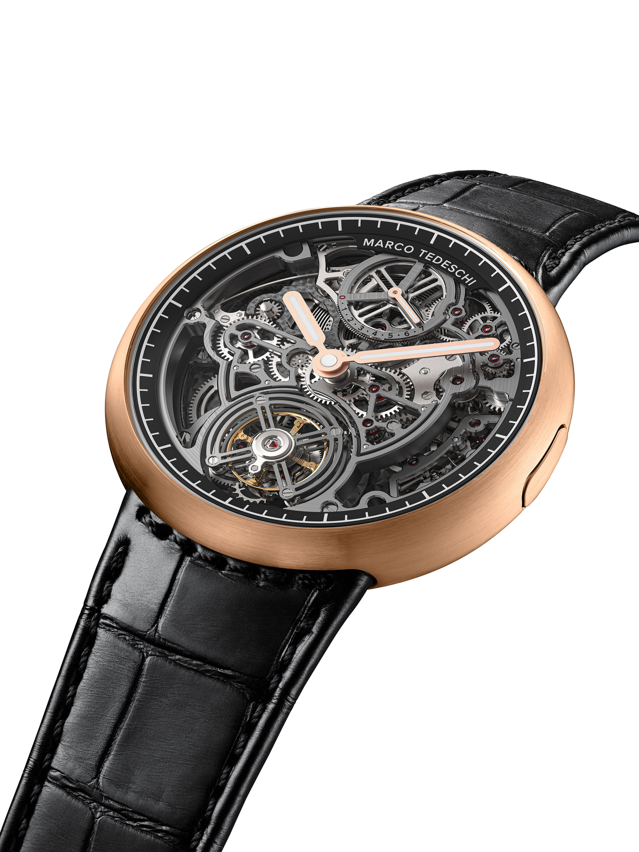 La MT1.1 est proposée en trois matériaux de boite différents : le titane grade 5 ELI, le tantale et l’or 5N. Chaque boite se distingue par une élégante finition satinée circulaire, subtilement contrastée par des chanfreins polis qui soulignent son caractère raffiné. Coté mouvemement, la platine principale et les ponts sont réalisés en maillechort sans plomb. Leurs surfaces associent finitions satinées et perlées, tandis que les flancs sont soigneusement brossés et les anglages polis à la main. Un traitement sombre au ruthénium vient enrichir l’ensemble, créant un contraste visuel saisissant. Les composants en acier présentent une finition satinée avec des angles polis, tandis que chaque roue est ajourée et cerclée, renforçant l’harmonie visuelle et la profondeur du mouvement.